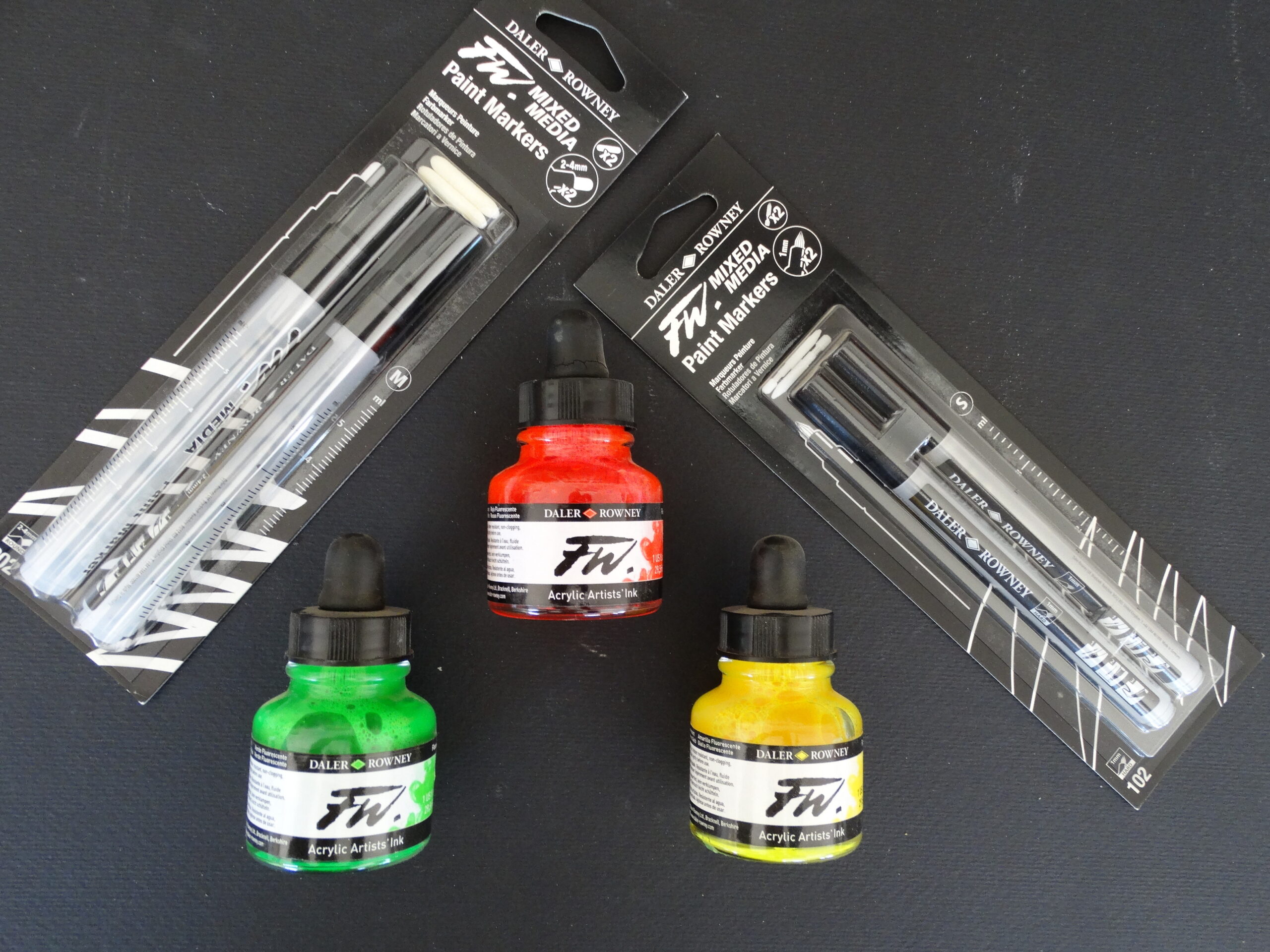 Gli inchiostri acrilici FW di Daler Rowney sono dei veri e proprio colori acrilici ma caratterizzati da una consistenza liquida simile a quella di un inchiostro. Vengono realizzati con pigmenti di qualità superiore e legati con una speciale emulsione acrilica. La loro formula ultra-fluida garantisce colori brillanti, altamente pigmentati e ad asciugatura rapida, offrendo un’ottima adesione su diversi supporti. Permanenti, idrorepellenti e resistenti alla luce, agli agenti chimici e all’abrasione, sono pronti all’uso e ideali per aerografo, pennini, pennelli e pennarelli ricaricabili. Perfetti per illustrazione tecnica, grafica, calligrafia e decorazione, si adattano alle esigenze di artisti e designer. Sono confezionati in flaconi da 29,5 ml con contagocce, per un dosaggio preciso. Tutte le tonalità sono miscelabili tra loro e compatibili con altri acrilici e medium.