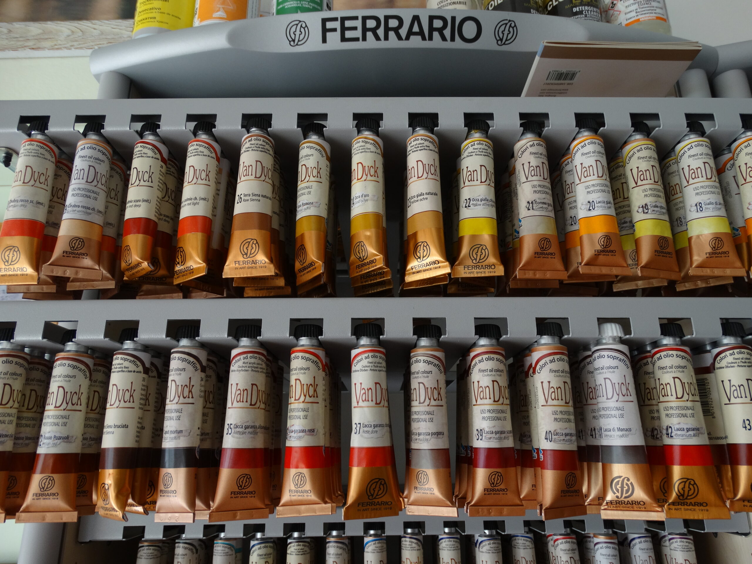 I colori ad olio Van Dyck di Ferrario sono colori ad olio sopraffini, pensati per usi professionali. Questi colori sono realizzati con pigmenti naturali e sintetici di alta qualità, garantendo purezza delle tinte, ottima miscelatura e stabilità alla luce. La consistenza pastosa e coprente dei colori Van Dyck li rende ideali per diverse tecniche pittoriche, assicurando un’applicazione uniforme e risultati duraturi. Sono utilizzabili esclusivamente su tele e cartoni telati.