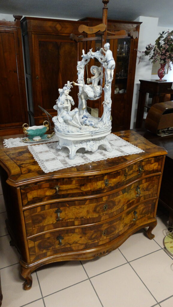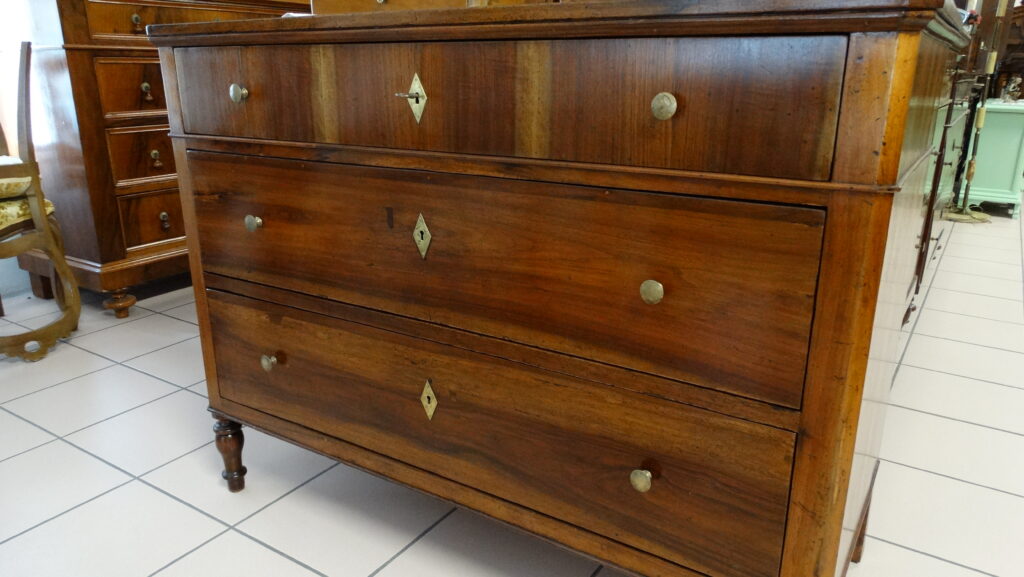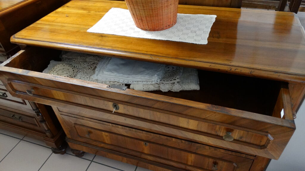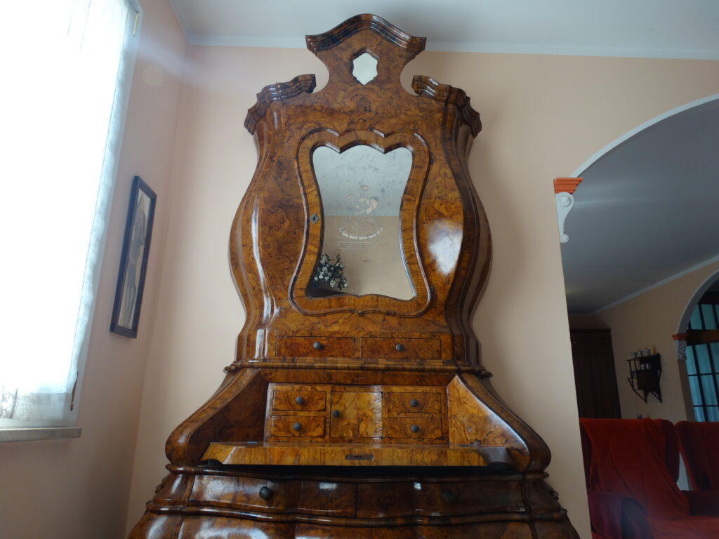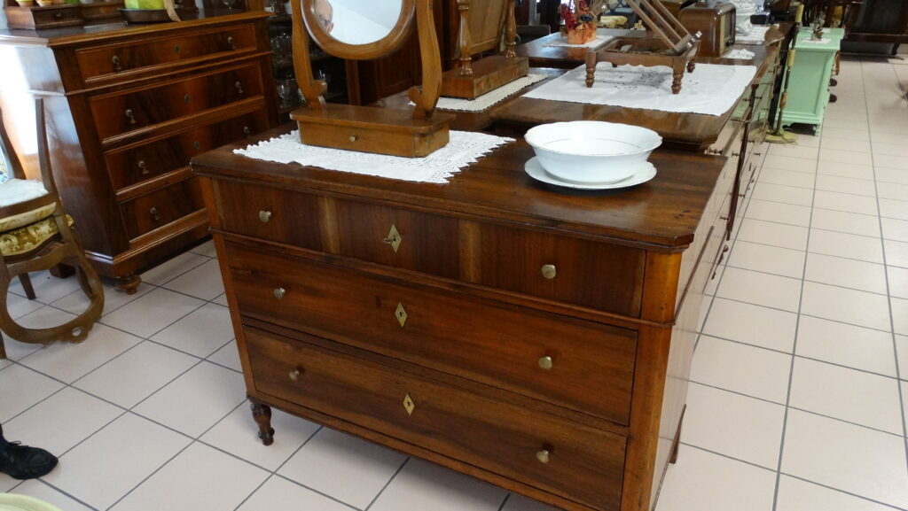 La nostra mostra comprende prevalentemente pezzi dagli anni Seicento al Novecento, tutti restaurati artigianalmente con estrema cura e nel rispetto della loro autenticità. Ogni pezzo racconta una storia e rappresenta un’epoca: dai maestosi cassoni seicenteschi in noce intagliata ai comò e scrittoi in mogano dell’Ottocento, fino ai mobili in radica e legni di frutto del primo Novecento. Ogni mobile, oltre a essere un oggetto d’arredo, è un testimone del passato: credenze, vetrine, tavoli, sedie, librerie, console e comodini che riportano in vita il fascino delle dimore storiche.